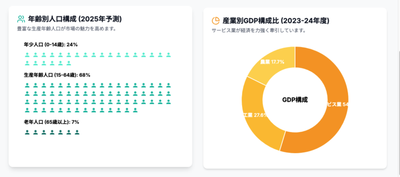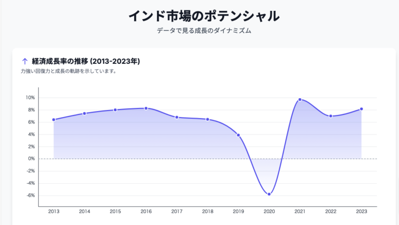 【私たちの支援】私たちは、貴社の製品・サービスがインドのどの地域、どの所得層に最も響くのかを、現地ネットワークを駆使した緻密な市場調査によって特定します。 - 著しい経済成長とビジネスチャンス IT、製造業、サービス業を中心に、インド経済は力強い成長を続けています。特に政府が推進する「メイク・イン・インディア」政策は、外国からの投資や技術移転を歓迎しており、追い風が吹いています。